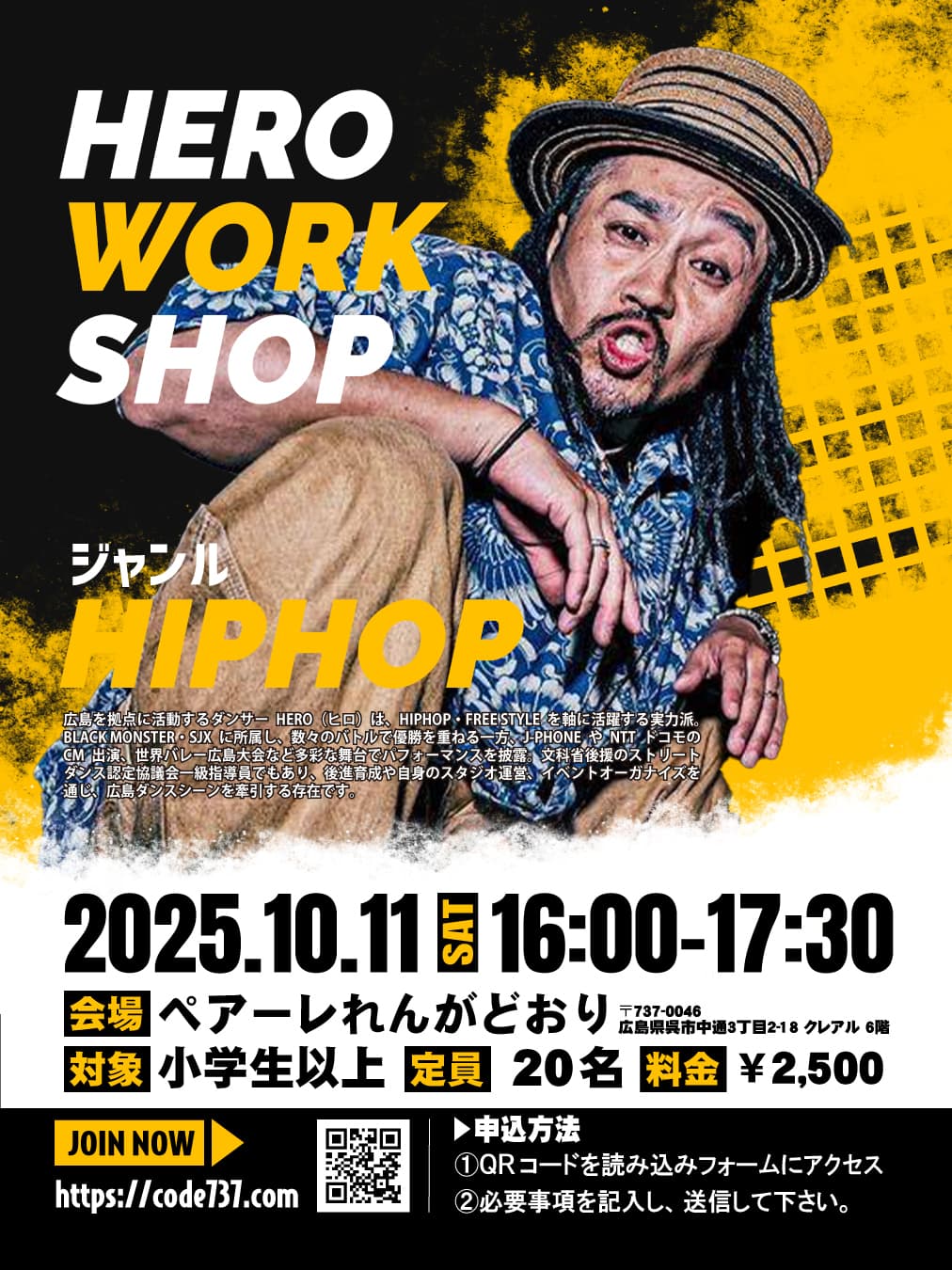広島を拠点に活動するダンサーHERO(ヒロ)は、HIPHOP・FREE STYLEを軸に活躍する実力派。BLACK MONSTER・SJXに所属し、数々のバトルで優勝を重ねる一方、J-PHONEやNTTドコモのCM出演、世界バレー広島大会など多彩な舞台でパフォーマンスを披露。文科省後援のストリートダンス認定協議会一級指導員でもあり、後進育成や自身のスタジオ運営、イベントオーガナイズを通じ、広島ダンスシーンを牽引する存在です。